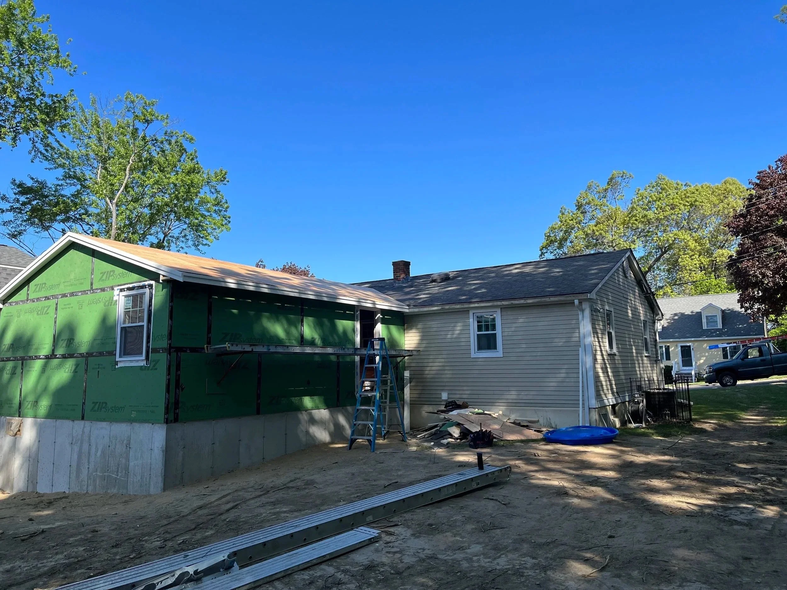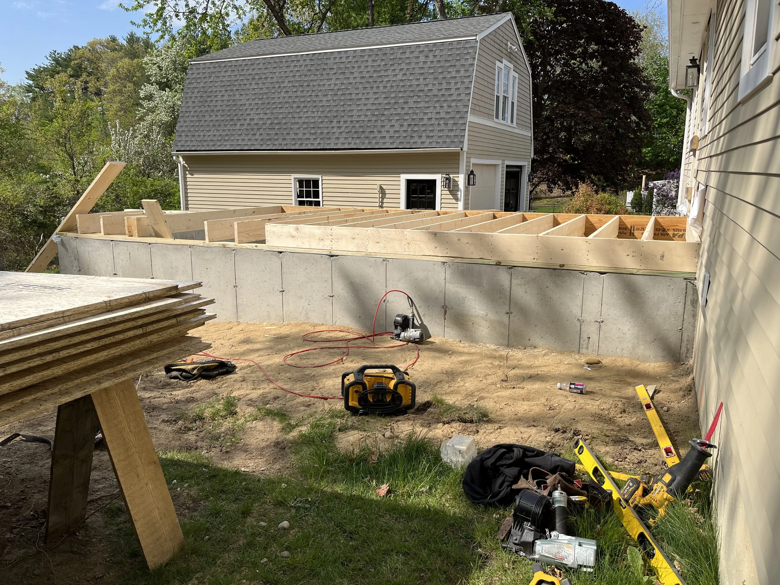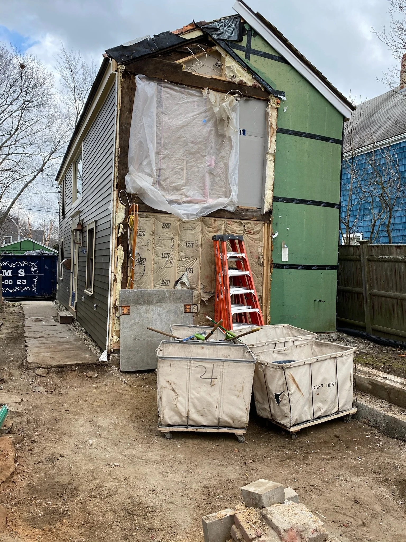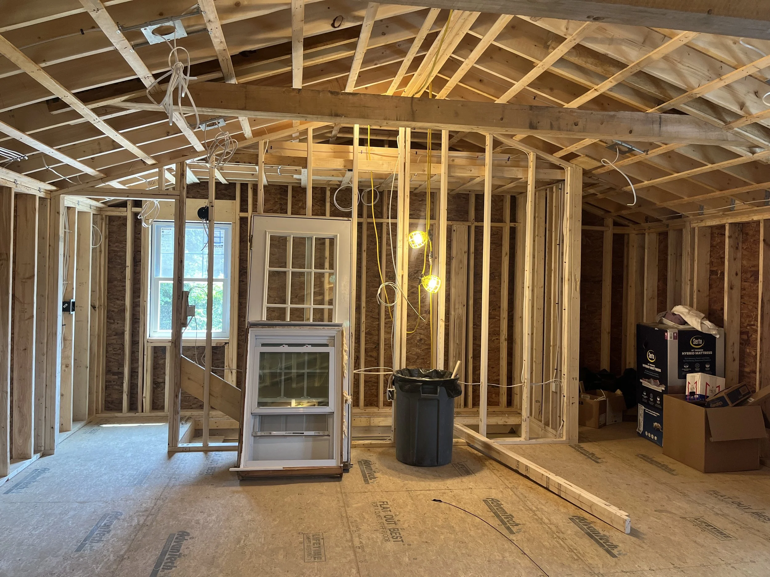 HAVING NO DRIVEWAY OR LAND TO SPEAK OF MADE THIS JOB ALREADY CHALLENGING ENOUGH TO DO THE WORK. EVERY DELIVERY HAD TO BE DONE IN THE STREET SO THEY WERE DONE FIRST THING IN THE MORNING AND WHATEVER WAS LEFT AT THE END OF THE DAY WAS PUT INSIDE OF THE ADDITION IN ORDER TO NOT BE AN INCONVENIENCE TO THE NEIGHBORHOOD.
